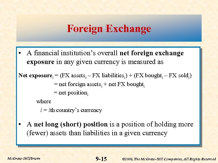 Foreign Exchange • A financial institution’s overall net foreign exchange exposure in any given currency is measured as Net exposurei = (FX assetsi – FX liabilitiesi) + (FX boughti – FX soldi) = net foreign assetsi + net FX boughti = net positioni where i = ith country’s currency • A net long (short) position is a position of holding more (fewer) assets than liabilities in a given currency Mc. Graw-Hill/Irwin 9 -15 © 2009, The Mc. Graw-Hill Companies, All Rights Reserved