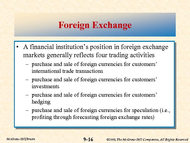 Foreign Exchange • A financial institution’s position in foreign exchange markets generally reflects four trading activities – purchase and sale of foreign currencies for customers’ international trade transactions – purchase and sale of foreign currencies for customers’ investments – purchase and sale of foreign currencies for customers’ hedging – purchase and sale of foreign currencies for speculation (i. e. , profiting through forecasting foreign exchange rates) Mc. Graw-Hill/Irwin 9 -16 © 2009, The Mc. Graw-Hill Companies, All Rights Reserved