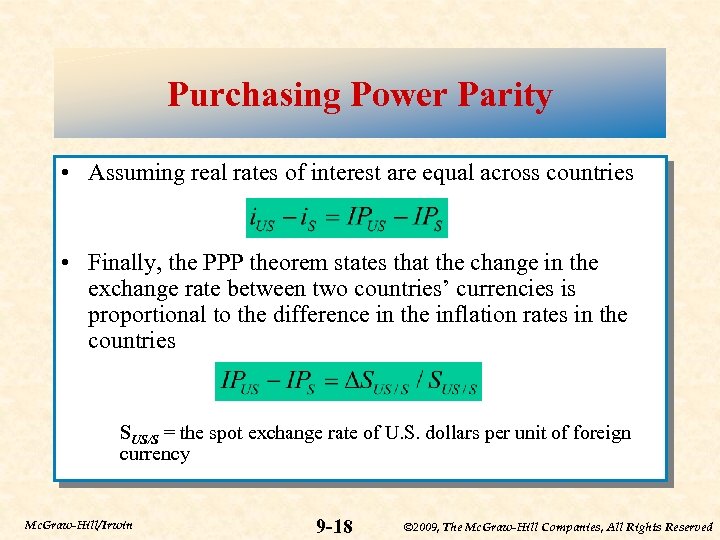Purchasing Power Parity • Purchasing power parity (PPP) is theory explaining the change in foreign currency exchange rates as inflation rates in the countries change i = interest rate IP = inflation rate RIR = real rate of interest US = the United States S = foreign country Mc. Graw-Hill/Irwin 9 -17 © 2009, The Mc. Graw-Hill Companies, All Rights Reserved