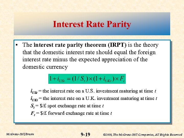 Interest Rate Parity • The interest rate parity theorem (IRPT) is theory that the domestic interest rate should equal the foreign interest rate minus the expected appreciation of the domestic currency i. USt = the interest rate on a U. S. investment maturing at time t i. UKt = the interest rate on a U. K. investment maturing at time t St = $/£ spot exchange rate at time t Ft = $/£ forward exchange rate at time t Mc. Graw-Hill/Irwin 9 -19 © 2009, The Mc. Graw-Hill Companies, All Rights Reserved