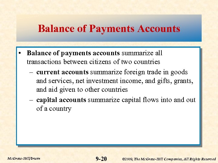 Balance of Payments Accounts • Balance of payments accounts summarize all transactions between citizens of two countries – current accounts summarize foreign trade in goods and services, net investment income, and gifts, grants, and aid given to other countries – capital accounts summarize capital flows into and out of a country Mc. Graw-Hill/Irwin 9 -20 © 2009, The Mc. Graw-Hill Companies, All Rights Reserved