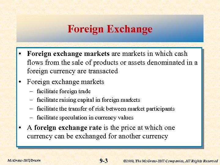 Overview of Foreign Exchange Markets • Today’s U. S. -based companies operate globally • Events and movements in foreign financial markets can affect the profitability and performance of U. S. firms • Foreign trade is possible because of the ease with which foreign currencies can be exchanged – U. S. imported $2. 9 trillion worth of goods in 2007 – U. S. exported $2. 2 trillion worth of goods in 2007 • Internationally active firms often seek to hedge their foreign currency exposure Mc. Graw-Hill/Irwin 9 -2 © 2009, The Mc. Graw-Hill Companies, All Rights Reserved
