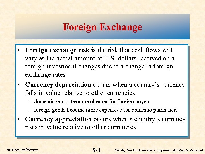 Foreign Exchange • Foreign exchange risk is the risk that cash flows will vary as the actual amount of U. S. dollars received on a foreign investment changes due to a change in foreign exchange rates • Currency depreciation occurs when a country’s currency falls in value relative to other currencies – domestic goods become cheaper foreign buyers – foreign goods become more expensive for domestic purchasers • Currency appreciation occurs when a country’s currency rises in value relative to other currencies Mc. Graw-Hill/Irwin 9 -4 © 2009, The Mc. Graw-Hill Companies, All Rights Reserved