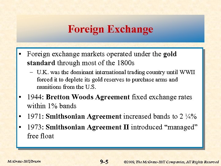 Foreign Exchange • Foreign exchange markets operated under the gold standard through most of the 1800 s – U. K. was the dominant international trading country until WWII forced it to deplete its gold reserves to purchase arms and munitions from the U. S. • 1944: Bretton Woods Agreement fixed exchange rates within 1% bands • 1971: Smithsonian Agreement increased bands to 2 ¼% • 1973: Smithsonian Agreement II introduced “managed” free float Mc. Graw-Hill/Irwin 9 -5 © 2009, The Mc. Graw-Hill Companies, All Rights Reserved
