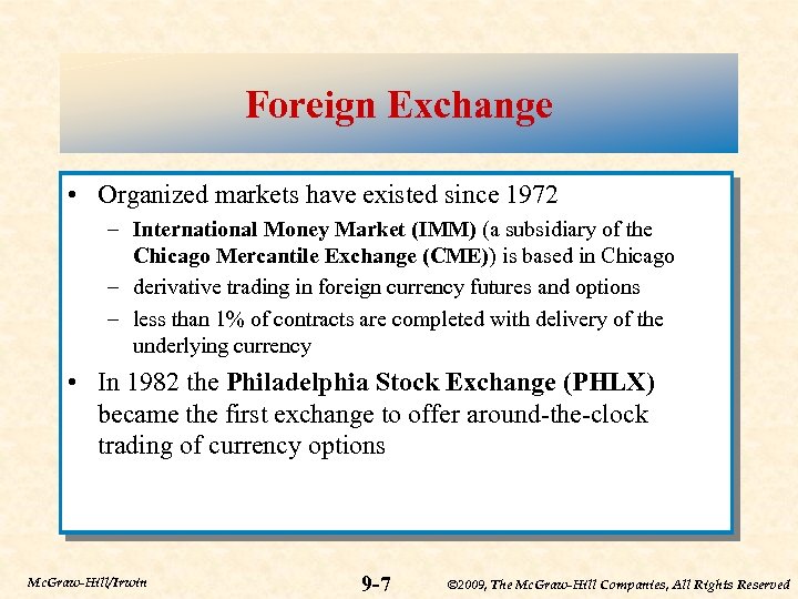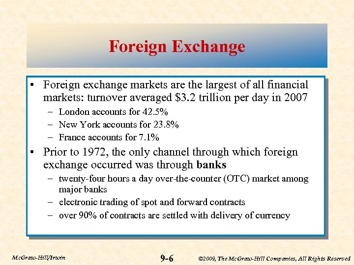 Foreign Exchange • Foreign exchange markets are the largest of all financial markets: turnover averaged $3. 2 trillion per day in 2007 – London accounts for 42. 5% – New York accounts for 23. 8% – France accounts for 7. 1% • Prior to 1972, the only channel through which foreign exchange occurred was through banks – twenty-four hours a day over-the-counter (OTC) market among major banks – electronic trading of spot and forward contracts – over 90% of contracts are settled with delivery of currency Mc. Graw-Hill/Irwin 9 -6 © 2009, The Mc. Graw-Hill Companies, All Rights Reserved
