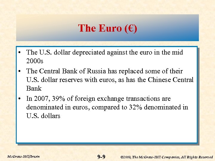 The Euro (€) • The European Community (EC) was formed in 1967 by consolidating three smaller communities – European Coal and Steel Community – European Economic Market – European Atomic Energy Community • The Maastricht Treaty of 1993 set the stage for the eventual creation of the Euro – created an integrated system of European central banks overseen by a single European Central Bank (ECB) • The Euro (€), the currency of the European Union (EU), began trading on January 1, 1999 when eleven European countries fixed their currencies’ exchange ratios • Euro notes and coins began circulating on January 1, 2002 Mc. Graw-Hill/Irwin 9 -8 © 2009, The Mc. Graw-Hill Companies, All Rights Reserved
