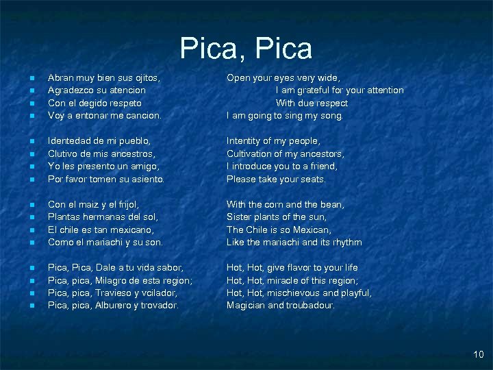 Pica, Pica n n n n Abran muy bien sus ojitos, Agradezco su atencion Con el degido respeto Voy a entonar me cancion. Open your eyes very wide, I am grateful for your attention With due respect I am going to sing my song. Identedad de mi pueblo, Clutivo de mis ancestros, Yo les presento un amigo, Por favor tomen su asiento. Intentity of my people, Cultivation of my ancestors, I introduce you to a friend, Please take your seats. Con el maiz y el frijol, Plantas hermanas del sol, El chile es tan mexicano, Como el mariachi y su son. With the corn and the bean, Sister plants of the sun, The Chile is so Mexican, Like the mariachi and its rhythm Pica, Dale a tu vida sabor, Pica, pica, Milagro de esta region; Pica, pica, Travieso y vcilador, Pica, pica, Alburero y trovador. Hot, give flavor to your life Hot, miracle of this region; Hot, mischievous and playful, Magician and troubadour. 10