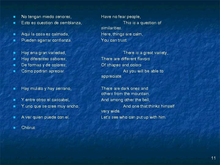 n n No tengan miedo senores, Esto es cuestion de semblanza, Aqui la cosa es calmada, Pueden agarrar confianza. Have no fear people, This is a question of similarities. Here, things are calm, You can trust. n Hay ena gran variedad, Hay diferentes sabores, De formas y de colores, Como podran apreciar. There is a great variety, There are different flavors Of shapes and colors As you will be able to appreciate. n Hay mulato y hay serrano, n n Y entre otros el cascabel, Y uno que se cree muy ancho, n A ver quien puede con el. There are dark ones and others from the mountain. And among other the bell, And one that thinks himself very wide. Let’s see who can put up with him. n Chorus n n n 11