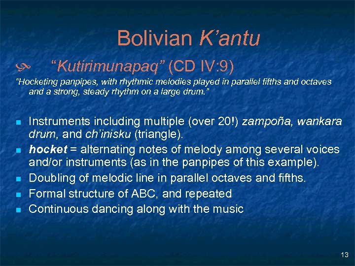 Bolivian K’antu h “Kutirimunapaq” (CD IV: 9) “Hocketing panpipes, with rhythmic melodies played in parallel fifths and octaves and a strong, steady rhythm on a large drum. ” n n n Instruments including multiple (over 20!) zampoña, wankara drum, and ch’inisku (triangle). hocket = alternating notes of melody among several voices and/or instruments (as in the panpipes of this example). Doubling of melodic line in parallel octaves and fifths. Formal structure of ABC, and repeated Continuous dancing along with the music 13