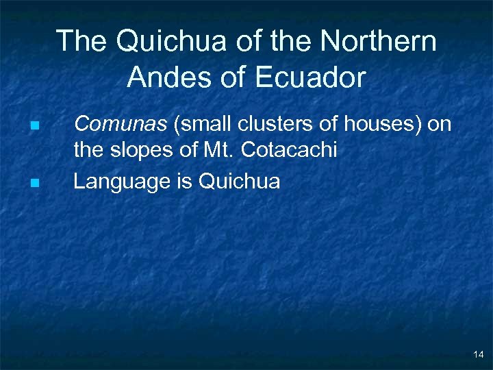 The Quichua of the Northern Andes of Ecuador n n Comunas (small clusters of houses) on the slopes of Mt. Cotacachi Language is Quichua 14