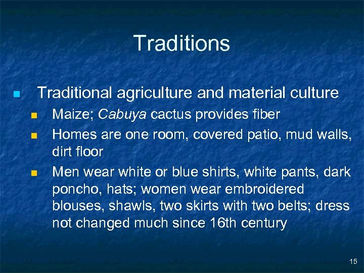 Traditions n Traditional agriculture and material culture n n n Maize; Cabuya cactus provides fiber Homes are one room, covered patio, mud walls, dirt floor Men wear white or blue shirts, white pants, dark poncho, hats; women wear embroidered blouses, shawls, two skirts with two belts; dress not changed much since 16 th century 15