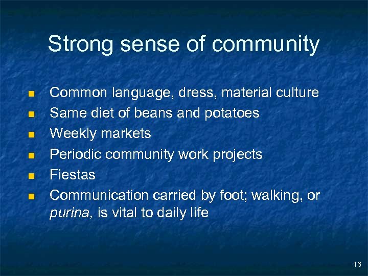 Strong sense of community n n n Common language, dress, material culture Same diet of beans and potatoes Weekly markets Periodic community work projects Fiestas Communication carried by foot; walking, or purina, is vital to daily life 16