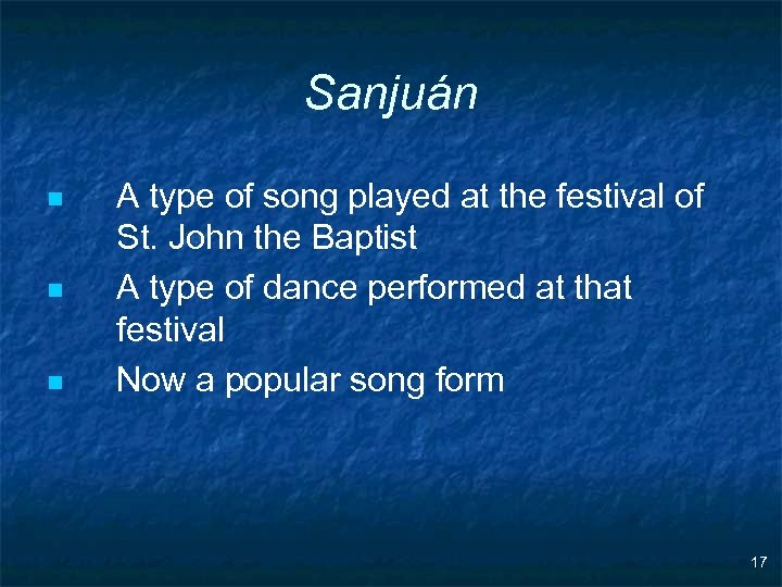 Sanjuán n A type of song played at the festival of St. John the Baptist A type of dance performed at that festival Now a popular song form 17