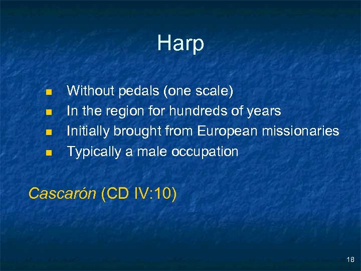 Harp n n Without pedals (one scale) In the region for hundreds of years Initially brought from European missionaries Typically a male occupation Cascarón (CD IV: 10) 18