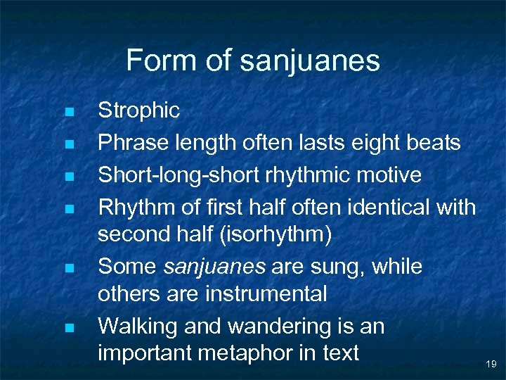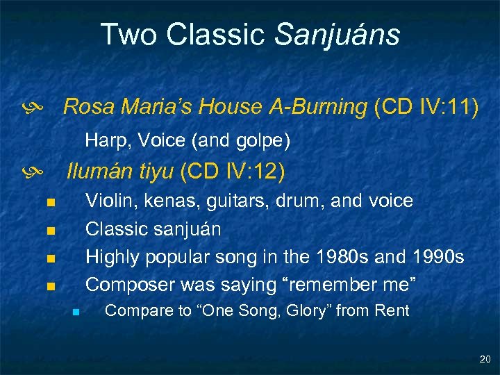 Form of sanjuanes n n n Strophic Phrase length often lasts eight beats Short-long-short rhythmic motive Rhythm of first half often identical with second half (isorhythm) Some sanjuanes are sung, while others are instrumental Walking and wandering is an important metaphor in text 19