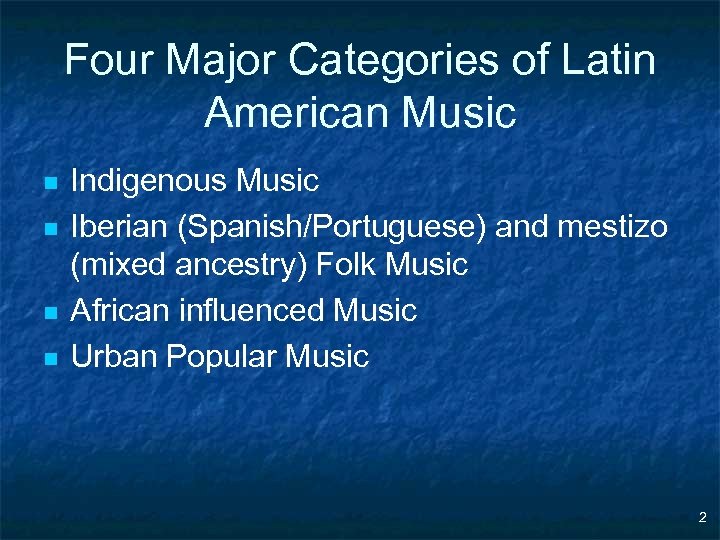 Four Major Categories of Latin American Music n n Indigenous Music Iberian (Spanish/Portuguese) and mestizo (mixed ancestry) Folk Music African influenced Music Urban Popular Music 2