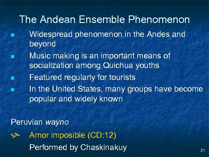 The Andean Ensemble Phenomenon n n Widespread phenomenon in the Andes and beyond Music making is an important means of socialization among Quichua youths Featured regularly for tourists In the United States, many groups have become popular and widely known Peruvian wayno h Amor imposible (CD: 12) Performed by Chaskinakuy 21