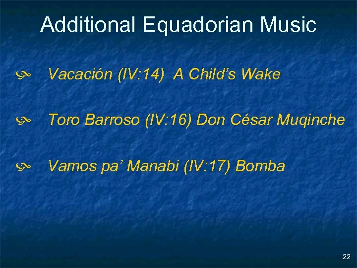 Additional Equadorian Music h Vacación (IV: 14) A Child’s Wake h Toro Barroso (IV: 16) Don César Muqinche h Vamos pa’ Manabi (IV: 17) Bomba 22