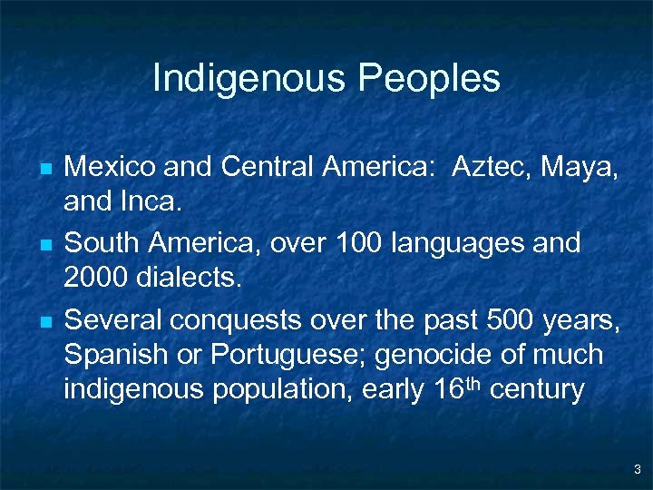 Indigenous Peoples n n n Mexico and Central America: Aztec, Maya, and Inca. South America, over 100 languages and 2000 dialects. Several conquests over the past 500 years, Spanish or Portuguese; genocide of much indigenous population, early 16 th century 3