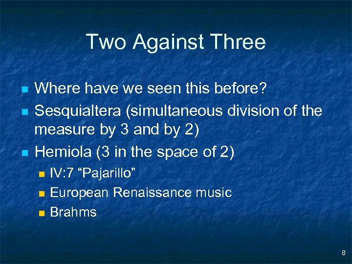 Two Against Three n n n Where have we seen this before? Sesquialtera (simultaneous division of the measure by 3 and by 2) Hemiola (3 in the space of 2) n n n IV: 7 “Pajarillo” European Renaissance music Brahms 8