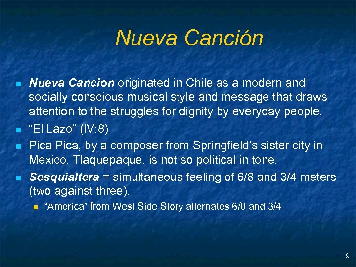 Nueva Canción n n Nueva Cancion originated in Chile as a modern and socially conscious musical style and message that draws attention to the struggles for dignity by everyday people. “El Lazo” (IV: 8) Pica, by a composer from Springfield’s sister city in Mexico, Tlaquepaque, is not so political in tone. Sesquialtera = simultaneous feeling of 6/8 and 3/4 meters (two against three). n “America” from West Side Story alternates 6/8 and 3/4 9