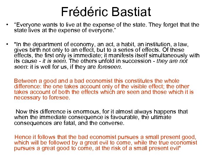 Frédéric Bastiat • “Everyone wants to live at the expense of the state. They forget that the state lives at the expense of everyone. ” • "In the department of economy, an act, a habit, an institution, a law, gives birth not only to an effect, but to a series of effects. Of these effects, the first only is immediate; it manifests itself simultaneously with its cause - it is seen. The others unfold in succession - they are not seen: it is well for us, if they are foreseen. Between a good and a bad economist this constitutes the whole difference: the one takes account only of the visible effect; the other takes account of both the effects which are seen and those which it is necessary to foresee. Now this difference is enormous, for it almost always happens that when the immediate consequence is favourable, the ultimate consequences are fatal, and the converse. Hence it follows that the bad economist pursues a small present good, which will be followed by a great evil to come, while the true economist pursues a great good to come, at the risk of a small present evil"