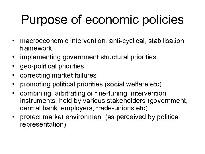 Purpose of economic policies • macroeconomic intervention: anti-cyclical, stabilisation framework • implementing of government structural priorities • geo-political priorities • correcting market failures • promoting political priorities (social welfare etc) • combining, arbitrating or fine-tuning intervention instruments, held by various stakeholders (government, central bank, employers, trade-unions etc) • protect market environment (as perceived by political representation)