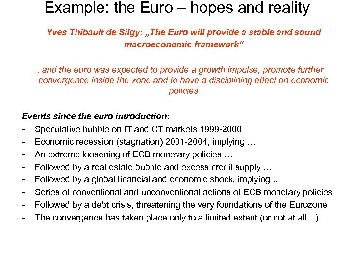 Example: the Euro – hopes and reality Yves Thibault de Silgy: „The Euro will provide a stable and sound macroeconomic framework“ … and the euro was expected to provide a growth impulse, promote further convergence inside the zone and to have a disciplining effect on economic policies Events since the euro introduction: - Speculative bubble on IT and CT markets 1999 -2000 - Economic recession (stagnation) 2001 -2004, implying … - An extreme loosening of ECB monetary policies … - Followed by a real estate bubble and excess credit supply … - Followed by a global financial and economic shock, implying. . - Series of conventional and unconventional actions of ECB monetary policies - Followed by a debt crisis, threatening the very foundations of the Eurozone - The convergence has taken place only to a limited extent (or not at all…)