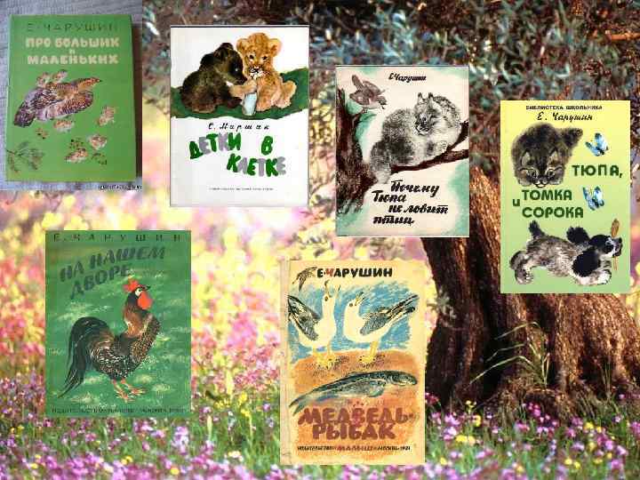До войны Евгений Иванович создал около двух десятков книг: "Птенцы" (1930), "Волчишко и другие" (1931), "Облава" (1931), "Цыплячий город" (1931), "Джунгли - птичий рай" (1931), "Животные жарких стран" (1935), продолжал иллюстрировать других авторов, среди которых С. Я. Маршак, М. М. Пришвин, В. В. Бианки, А. И. Введенский. "То, что производило на меня большое впечатление в детстве, - говорил художник, - волнует и сейчас. Больше всего я люблю изображать молодых животных, трогательных в своей беспомощности и интересных, потому что в них уже угадывается взрослый зверь". В 1945 году художник вернулся в Ленинград. Помимо работы над книгами, он создал серию эстампов с изображениями животных. Ещё до войны он увлёкся скульптурой, расписывал чайные сервизы, а в послевоенные годы делал из фарфора фигурки животных и целые декоративные группы. К оформлению детских книг он попробовал подойти иначе. На его рисунках стало обозначаться пространство, появилась перспектива. Звери порой изображались более сказочными и, скорее, напоминали героев Васнецова. Менялась и техника: художник начал работать гуашью и акварелью, но не широкими мазками, а тщательно прорабатывая в рисунке мелкие детали. В том же 1945 году Е. И. Чарушин получил звание Заслуженный деятель искусств РСФСР. Последней книгой Чарушина стали "Детки в клетке" С. Я. Маршака. А в 1965 году ему посмертно была присуждена золотая медаль на международной выставке детской книги в Лейпциге.
