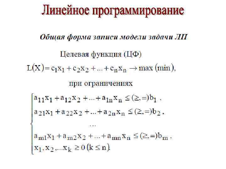 Линейное программирование (ЛП) является наиболее простым и лучше всего изученным разделом математического программирования. Характерные черты задач ЛП следующие: 1) показатель оптимальности L(X) представляет собой линейную функцию от элементов решения X = (x 1, x 2, . . . , xn ); 2) ограничительные условия, налагаемые на возможные решения, имеют вид линейных равенств или неравенств