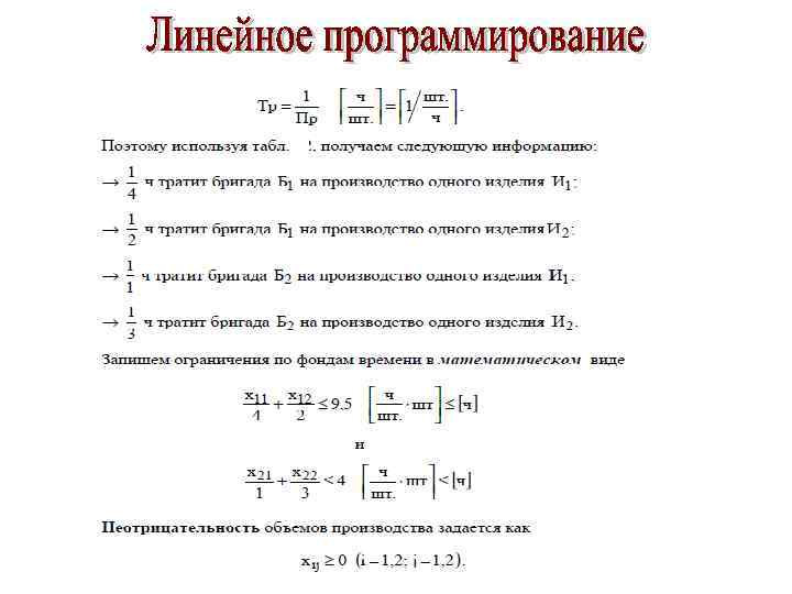 Решение: будем использовать двухиндексную форму записи xij – количество изделий Иj (j=1, 2), изготавливаемых бригадой Бi (i=1, 2), x 11 – количество изделий И 1, изготавливаемых бригадой Б 1, [шт. ]; x 12 – количество изделий И 2, изготавливаемых бригадой Б 1, [шт. ]; x 21 – количество изделий И 1, изготавливаемых бригадой Б 2 , [шт. ]; x 22 – количество изделий И 2, изготавливаемых бригадой Б 2 , [шт. ].