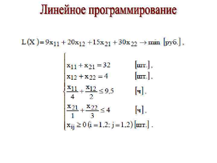 Составить математическую модель, позволяющую найти оптимальный объем выпуска изделий, обеспечивающий минимальные затраты на выполнение заказа. L(X )= 9 x 11 + 20 x 12 +15 x 21 + 30 x 22 →min Учитываем ограничения (Исходные данные)