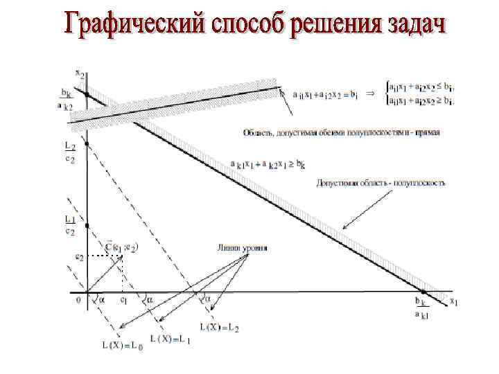 Методика решения задач ЛП графическим методом 1. В ограничениях задачи заменить знаки неравенств на знаки точных равенств и постройте соответствующие прямые. 2. Найти и заштриховать полуплоскости, разрешенные каждым из ограничений-неравенств задачи 3. Определить ОДР как часть плоскости, принадлежащую одновременно всем разрешенным областям, и выделить ее. 4. Если ОДР – не пустое множество, то постройте целевую прямую, т. е. любую из линий уровня где L – произвольное число, например, кратное т. е. удобное для проведения расчетов. 5. Постройте вектор , который начинается в точке (0; 0), заканчивается в точке (c 1, c 2). Если целевая прямая и вектор C построены верно, то они будут перпендикулярны. 6. При поиске max ЦФ передвигайте целевую прямую в направлении вектора C, при поиске min ЦФ – против направления вектора C. Последняя по ходу движения вершина ОДР будет точкой max или min ЦФ. 7. Определите координаты точки max (min) ЦФ Для вычисления координат оптимальной точки X∗ решите систему уравнений прямы на пересечении которых находится X∗.