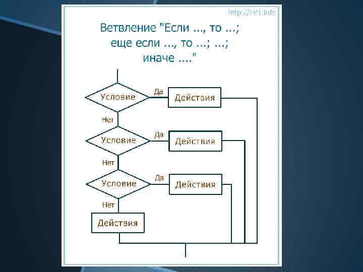 Разветвляющийся алгоритм Это алгоритм, в котором в зависимости от условия выполняется либо одна, либо другая последовательность действий.