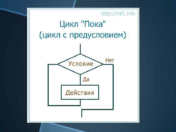 Цикл while Пока условие выполняется, будут выполняться действия тела цикла. Тело цикла может ни разу не выполнится.