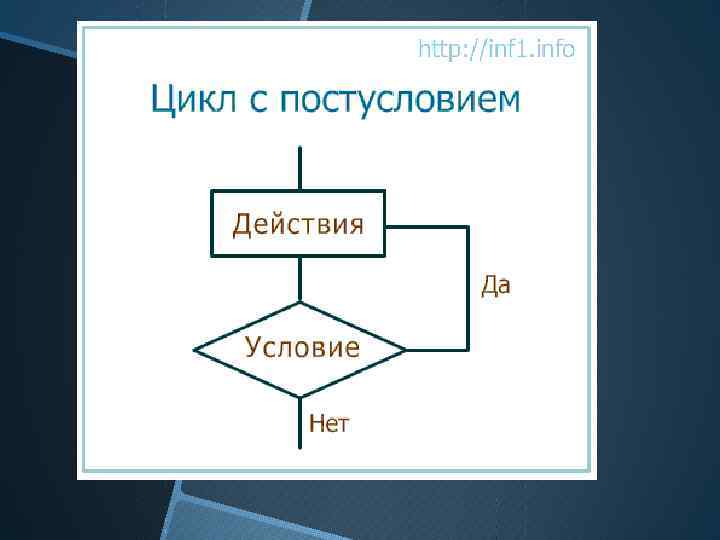 Цикл do В этом цикле первый раз условие проверяется лишь после выполнения действий тела цикла. Если условие истинно, то действия повторяются истинно снова. Каким бы ни было условие, тело данного цикла хотя бы раз, но выполнится.