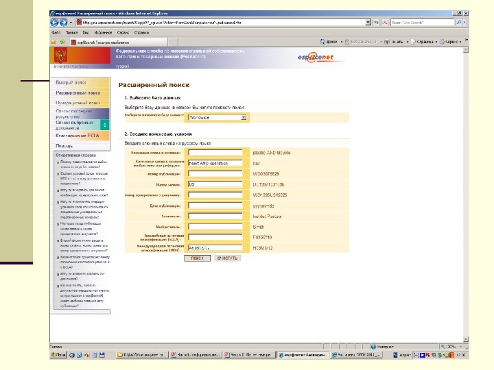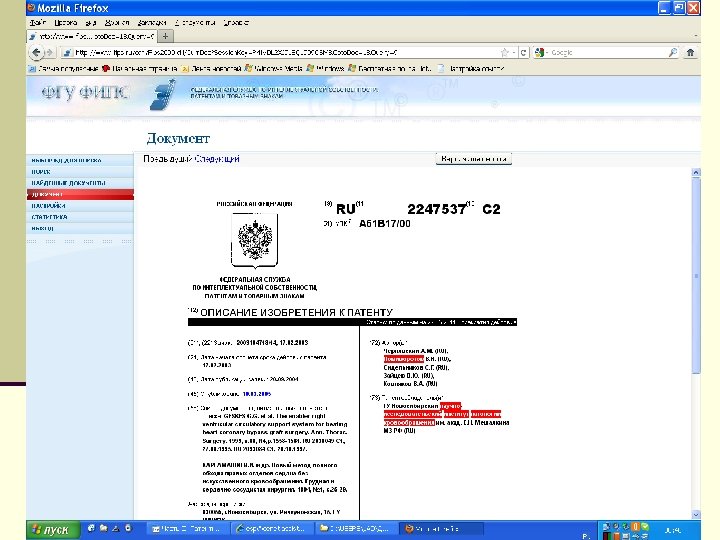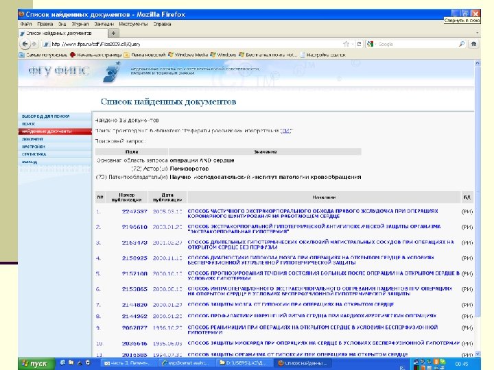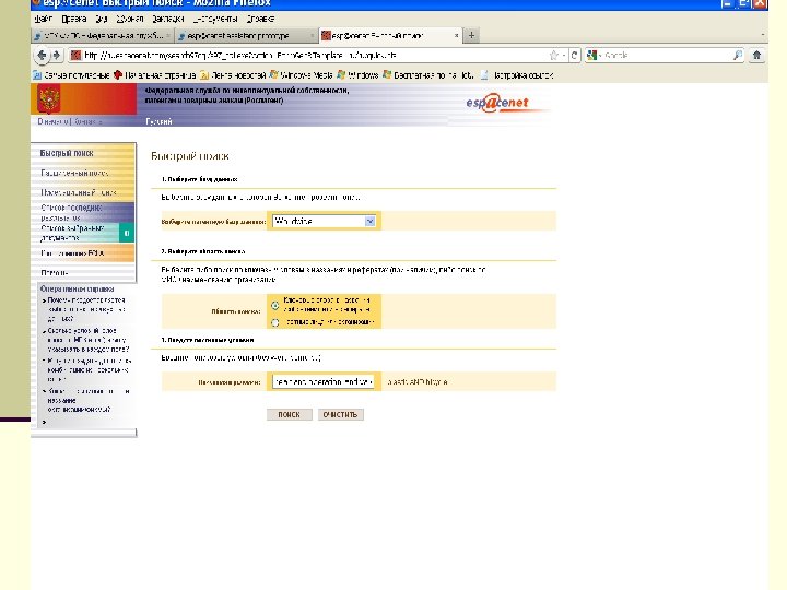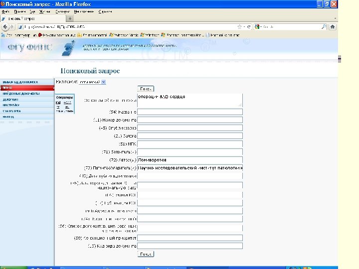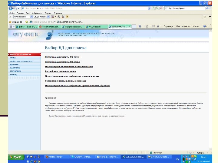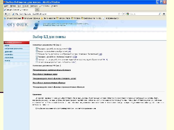 Алгоритм поиска http: // www 1. fips. ru Информационные ресурсы Вход в ИПС Выбор БД для поиска Поиск