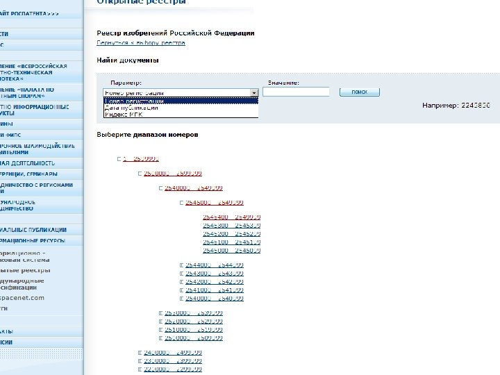 Открытые реестры на сайте ФИПС Полные тексты российских изобретений 1924 -2011 гг. Поиск по номеру документа, дате и классу МПК Алгоритм поиска: информационные ресурсы — открытые реестры — выбор раздела реестра - поиск