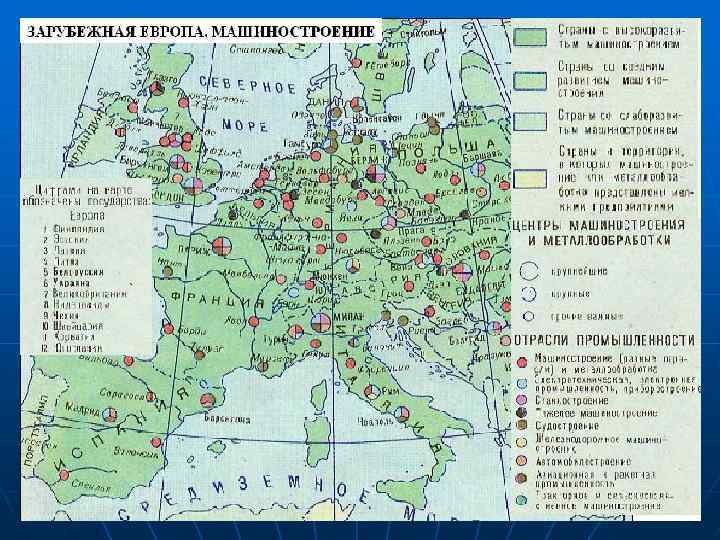 МАШИНОСТРОЕНИЕ В зарубежной Европе производится весь спектр изделий: от простых до сложных. Доля машиностроения во всей промышленной продукции Европы. Доля машиностроения в экспорте промышленной продукции Европы. Тяготеет к крупным городам и агломерациям: ориентация на трудовые ресурсы, научную базу и инфраструктуру. В наиболее развитых странах представлена практически в каждом достаточно крупном городе.