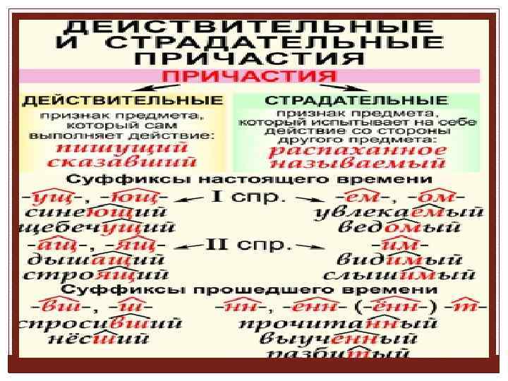 Чтобы научиться быстро находить причастия, нужно знать те суффиксы, при помощи которых они образуются от глаголов. Запомните эти суффиксы: -ущ- (-ющ-), -ащ- (-ящ-): защищающийся, летящий -ем- (-ом-), -им-: избираемый, гонимый -вш-, -ш-: лежавший, несший -нн-, -енн-, -т-: указанный, построенный, понятый