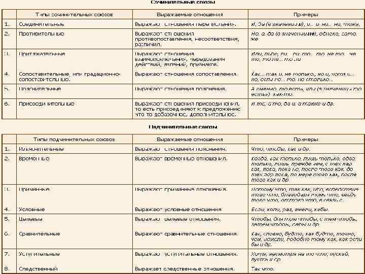 Сочинительные союзы по передаваемым ими грамматическим значениям делятся на: соединительные и, да (в значении и), тоже, также, а также, ни… ни и т. д. Маша и Петя пошли сегодня в школу. разделительные и т. д. или, либо, то… то, не то… не то, то ли… то ли. Не пойму, дождь или снег на улице. противительные а, но, да (в значении но), зато, однако, хотя, как и т. д. Это не дождь, а снег. сопоставительные так… как, если не… то, настолько… насколько, не только… но и и т. д. Я так знаю математику, как хватает способностей. пояснительные или, то есть, то бишь и т. д. Саша необыкновенный, то есть просто замечательный, человек.