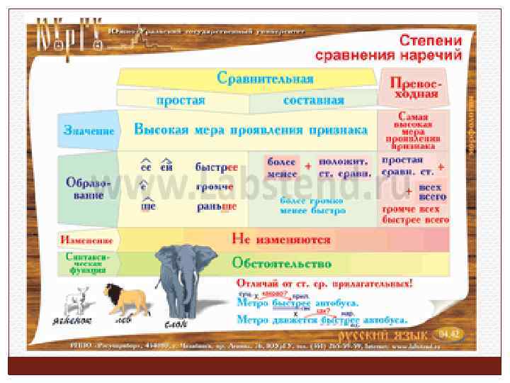 Наречия, образованные от качественных прилагательных имеют степени сравнения: основа + суффиксы : смазливее, младше; ПРЕВОСХОДНАЯ простая степень: основа + суффиксы ЕЙШЕ ( АЙШЕ) : строжайше, покорнейше. ПРЕВОСХОДНАЯ СЛОЖНАЯ степень: НАРЕЧИЕ + ВСЕХ (ВСЕГО) : старше всех, больше всего.