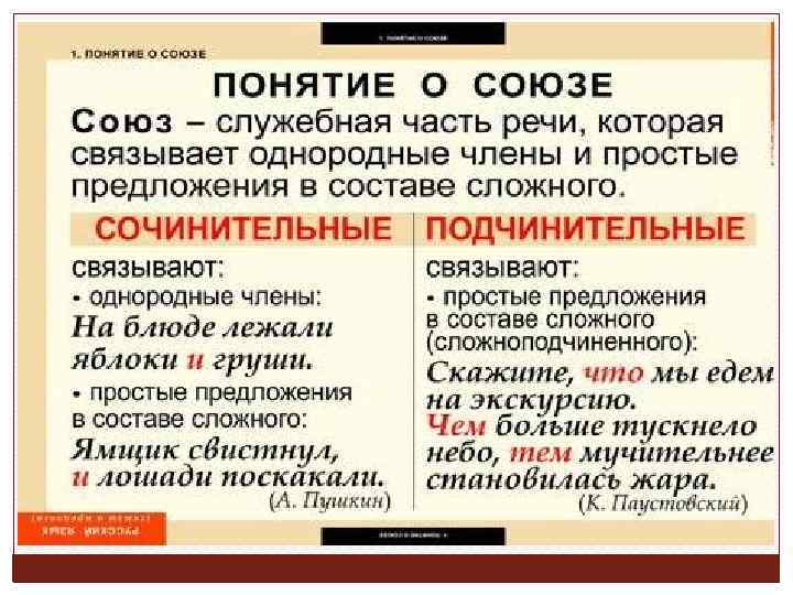 Простые и составные союзы. Союзы, состоящие из одного слова, простые, например: и, а, когда, если, а состоящие из двух и более слов, составные, например: потому что; не только… но и; так как; как будто.