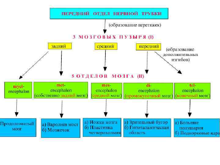 головной мозг эмбриона: I стадия трёх мозговых пузырей; II стадия образования пяти отделов мозга (II).