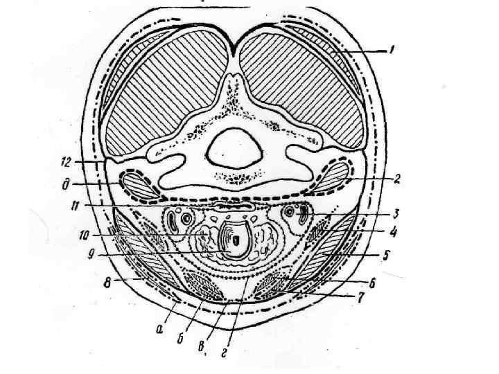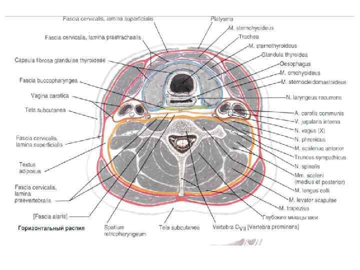 Фасции шеи (В. Н. Шевкуненко): 1. Поверхностная фасция – футляр для подкожной мышцы шеи 2. Собственная фасция шеи, поверхностный листок – охватывает всю шею, образует влагалище для трапециевидной и грудино-ключичнососцевидной мышцы. Вверху прикрепляется к подъязычной кости и краю нижней челюсти, внизу – к рукоятке грудины и ключице, с боков – у поперечным отросткам шейных позвонков.