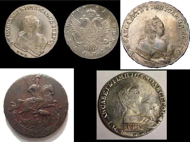 ЕЛИЗАВЕТА I ПЕТРОВНА • С 1730 года правящая верхушка постоянно испытывала давление со стороны наследников Петра Великого. Воспользовавшись падением авторитета Анны Леопольдовны, правившей за малолетнего Ивана VI, сторонники Елизаветы Петровны (дочери Петра I) организовали дворцовый переворот. Елизавета I продолжала политику своего отца, провела масштабные реформы в области образования и театральных искусств, но в то же время прославилась очень пышными торжествами и балами. Её гардероб насчитывал несколько тысяч платьев. • С 1757 года медная монетная стопа понижается до 16 рублей из пуда и начинают чеканиться монеты, почти не изменившиеся до 1796 года. Тогда же появляются несколько видов пробных монет, считающиеся сейчас раритетами. Несколько проб произведено и в золотой чеканке. К червонцу и двойному червонцу добавляются рубль, 2 рубля, 20 рублей, начинается чеканка империала (10 рублей) и полуимпериала (5 рублей).