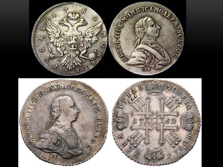 ПЁТР III ФЁДОРОВИЧ • После смерти Елизаветы было короткое правление Петра III (вначале носил имя Карл), внука Петра Первого (сына дочери Анны). Родился и жил в Швеции и сначала воспитывался как наследник шведского престола. В 1742 году Елизавета перевезла его в Россию, где через три года он женился на Екатерине, будущей императрице. Петр правил всего 186 дней, но за это время успел провести несколько важных реформ. • В серебре и золоте при Петре III успели ограниченным тиражом отчеканить несколько номиналов монет с портретом императора. Также император осуществил массовую перечеканку медных монет старого образца в новые с повышением номинала в 2 раза, проект был задуман ещё в 1760 году.