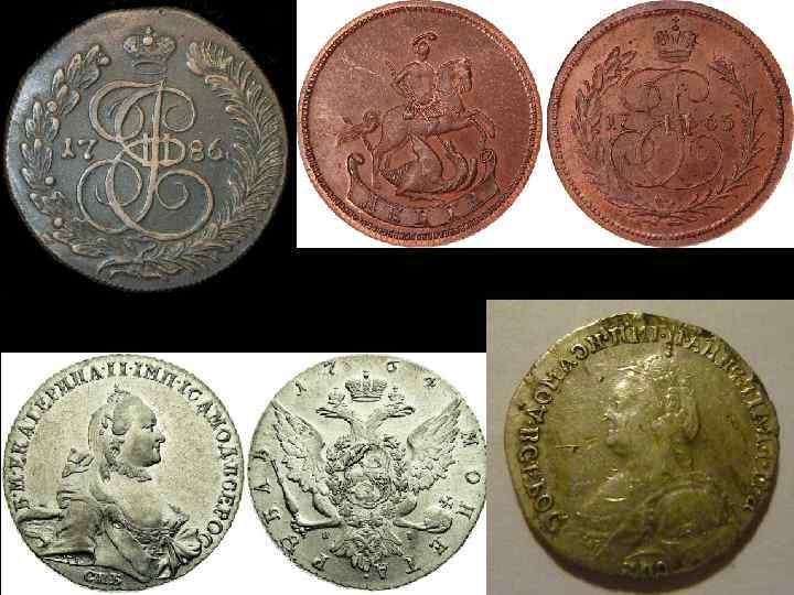 Медные монеты продолжают чеканиться по прежней стопе с рисунком образца 1757 года, но с вензелем Екатерины II. Только в 1796 году произведено понижение стопы в 2 раза и выпускаются новые типы медных монет, которым так и не суждено было прочно обосноваться в денежном обращении. С 1763 по 1781 год чеканились значительно более лёгкие "сибирские монеты" из меди колыванских рудников, в которой содержалась примесь золота и серебра. Впервые в истории чеканятся серебряные монеты номиналами 20 и 15 копеек. Известны также пробные серебряные 5 копеек и пробный "пугачёвский" рубль.