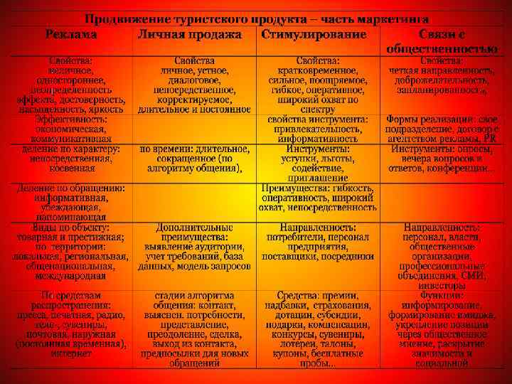5. 2. Основы эффективного продвижения и сбыта экскурс-услуг Лучшей основой для продвижения и сбыта экскурсного потенциала территории, по мнению географов, является ландшафтная карта, так как в этом случае объектами оценки служат синтетические единицы — природные и культурные территориальные комплексы. Ранг единицы определяется масштабом исследования и соответствующих ему карт: в мелком масштабе — физико-географические провинции, в среднем масштабе — районы, ландшафты или их крупные части — местности, в крупном масштабе - урочища и фации. К оценке эффективности продвижения приступают после составления схем ограничений рекреации и экскурсизма, учитывающих как природные, так и хозяйственные лимитирующие факторы. Примерами лимитирующих факторов могут быть дискомфортность климата, большая вероятность встретить хищных морских животных, неблагоприятные микроклиматические условия для санаторно-курортного лечения, дефицит пляжей, воды, территории для застройки и т. д. Зоны влияния городов и промышленных объектов, места разработки полезных ископаемых, контуры сельскохозяйственных угодий и т. п. не входят в территории, подлежащие оценке. На заключительном этапе работы выбирается форма оценки продвигаемости и сбыта экскурсов. К настоящему времени сложилось две взаимозаменяемые формы оценок: качественная и балльная. Сильная сторона качественных оценок заключается в том, что они позволяют логически обосновать оценочные признаки на основе анализа генезиса и морфологической структуры природных территориальных комплексов. Кроме того, к ним прибегают для определения «веса» фактора при использовании математических методов. Отличительной чертой балльных оценок является краткость выражения и возможность сопоставления. Более подробно: http: //worldwidetour. ru/content/8/4/