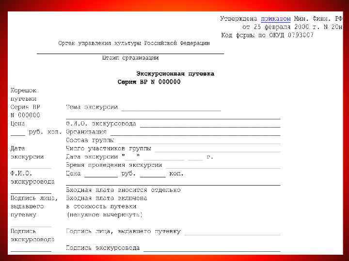 Вопрос 4. Документооборот экскурсной услуги Вопрос 4. Кроме указанных выше, в документооборот экскурсной услуги включаются следующие документы, необходимые услуги для планомерной реализации экскурса: реализации экскурса 1) Формулировки целей и задач экскурса 2) Список источников информации 3) Карточки (паспорта) объектов экскурса 4) Схема (карта) реализации экскурса 5) Портфель экскурса: папка с фото, схемы, карты, репродукции, образцы продукции, копии документов, наглядные пособия…) 6) Методическая разработка экскурса: рекомендации по реализации экскурса, методические приёмы, технические средства; 7) Дополнительные материалы: справки, таблицы, цифрорвые материалы, выдержки из источников… 8) Список экскурсоводов аттестованных и допущенных к реализации экскурса; пополняется по мере допуска к проведению